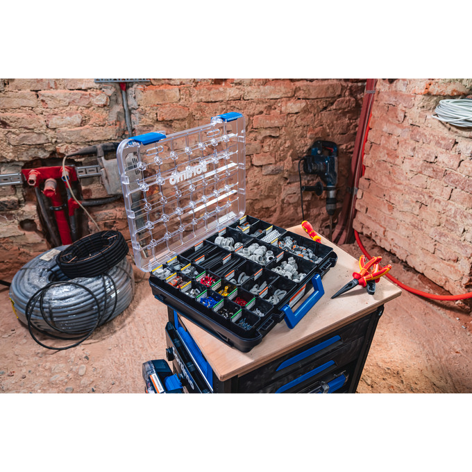 Die Sortimo T-BOXX revolutioniert Ihren Arbeitsalltag. Der transparente Deckel sorgt für einen sofortigen Überblick und sicheren Transport Ihrer Kleinteile. Ein spezielles Bodenraster und zusätzliche Deckelkronen bieten optimale Aufnahme und Sicherung für Insetboxen, um eine Vermischung der Inhalte zu verhindern. Dabei sind Anordnung und Entnahme der Boxen flexibel gestaltbar. Die T-BOXX ist mehr als ein Ordnungs- und Transportsystem: Sie spart Ihnen Suchzeit, ermöglicht eine ständige Bestandskontrolle und trägt so zu einem effizienten Arbeitsalltag bei. Die T-BOXX besteht aus robustem, leichtem Kunststoff und ist daher stoßfest und für vielfältige Anwendungen geeignet. Ein stabiler Griff und der große Öffnungswinkel des Deckels sorgen für bequeme Handhabung und uneingeschränkten Zugriff auf Ihre Materialien. Die T-BOXXen 320 und 330 lassen sich nahtlos in alle Sortimo Fahrzeugeinrichtungen und die WorkMo integrieren, wodurch ein durchgängiger Transport Ihrer Kleinteile vom Lager zum Einsatzort gewährleistet wird. Der kompakte Neuzugang T-BOXX 120 erweitert das Sortiment und kann bequem mit dem Deckel der größeren Modelle verbunden werden.(Abbildungen ähnlich, Dekomaterial nicht enthalten; Lieferung nur innerhalb Deutschlands)