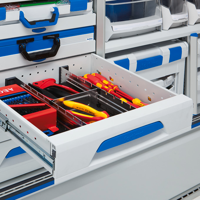 Die Schubladen Trennblechsätze unterteilen die Schublade in einzelne Bereiche. Diese können individuell an die unterschiedlichen Größen des Ladeguts angepasst werden. Somit können Sie innerhalb der Schublade noch einmal Ihre Werkzeuge und Arbeitsmaterialien organisieren und so sortieren, dass Sie diese jederzeit und schnell zur Hand haben, ohne lange suchen zu müssen.