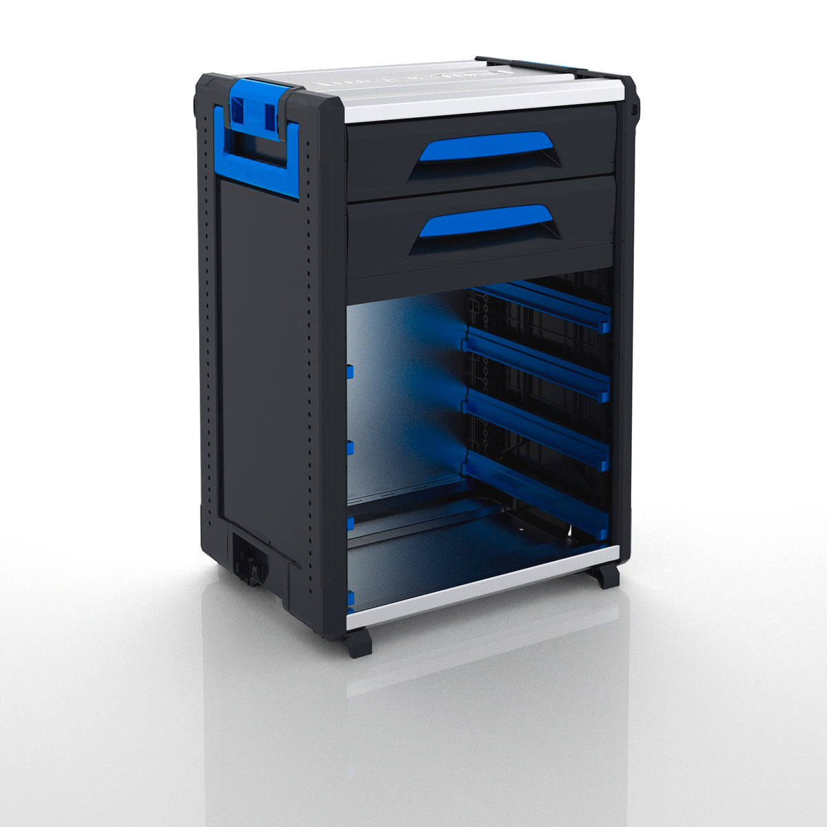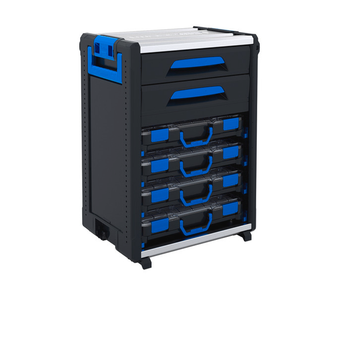 Dieses Modul ist mit einer Schublade in Höhe 6 (Innenmaß BxHxT: 418 x 89 x 314 mm), einer Schublade in Höhe 8 (Innenmaß BxHxT: 418 x 123 x 314 mm) und acht Kofferschienen ausgestattet, die wahlweise mit vier T-BOXXen oder vier Metallkoffern 320/321 bestückt werden können. Auch eine Kombination von Koffern und BOXXen ist möglich. Die Kofferschienen verfügen über Arretierungen, die ein unkontrolliertes Herausrutschen der Koffern und BOXXen verhindern. Zur Entnahme müssen die Koffer oder BOXXen leicht angehoben werden, um sie dann herauszuziehen. Die Schubladen lassen sich mit Zubehör wie Insetboxen, Kleinteileeinsätzen oder Trennblechen flexibel unterteilen und sorgen so für noch mehr Übersichtlichkeit und Ordnung. Optionale Antirutschmatten auf dem Schubladenboden verhindern ein Verrutschen des Inhalts und dämpfen Geräusche.