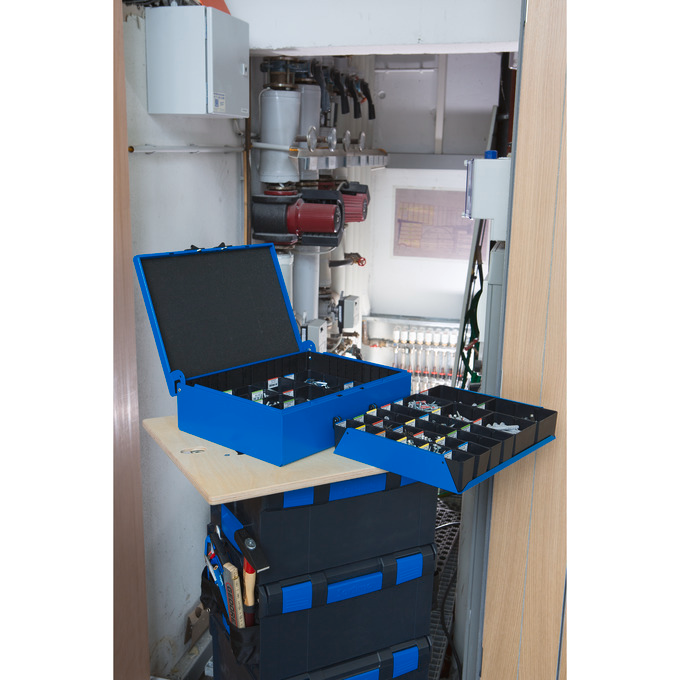 Die Anordnung der Insetboxen kann beliebig geändert werden, auch eine Entnahme einzelner Insetboxen ist möglich. Darüber hinaus haben Sie mit den Insetboxen stets den aktuellen Bestand an Kleinteilen und Verbrauchsmitteln im Blick. Somit können Sie rechtzeitig auf Engpässe reagieren und Ausfallzeiten vermeiden. Der Metallkoffer überzeugt als zuverlässiges und praktisches Ordnungssystem. Hohe Zuladung und schwere Bestückung stellen in Sachen Funktionalität keine Einschränkung dar. Praktische Einhandbedienung mit 120 Grad Anschlagwinkel des Deckels und die flexible Ordnung im Inneren schaffen ein Höchstmaß an Arbeitserleichterung. Durch den ergonomisch geformten Tragegriff an der Vorderseite ist der Metallkoffer komfortabel im Handling und bietet Ihnen einen besonders angenehmen Tragekomfort. Die standardmäßig enthaltende Deckeleinlage aus Schaumstoff schließt die Insetboxen nach oben ab und verhindert somit ein Durchmischen der darin befindlichen Inhalte. Der Metallkoffer lässt sich problemlos in Sortimo Fahrzeugeinrichtungen und WorkMo Module integrieren.(Abbildungen ähnlich, Dekomaterial nicht enthalten; Lieferung nur innerhalb Deutschlands)